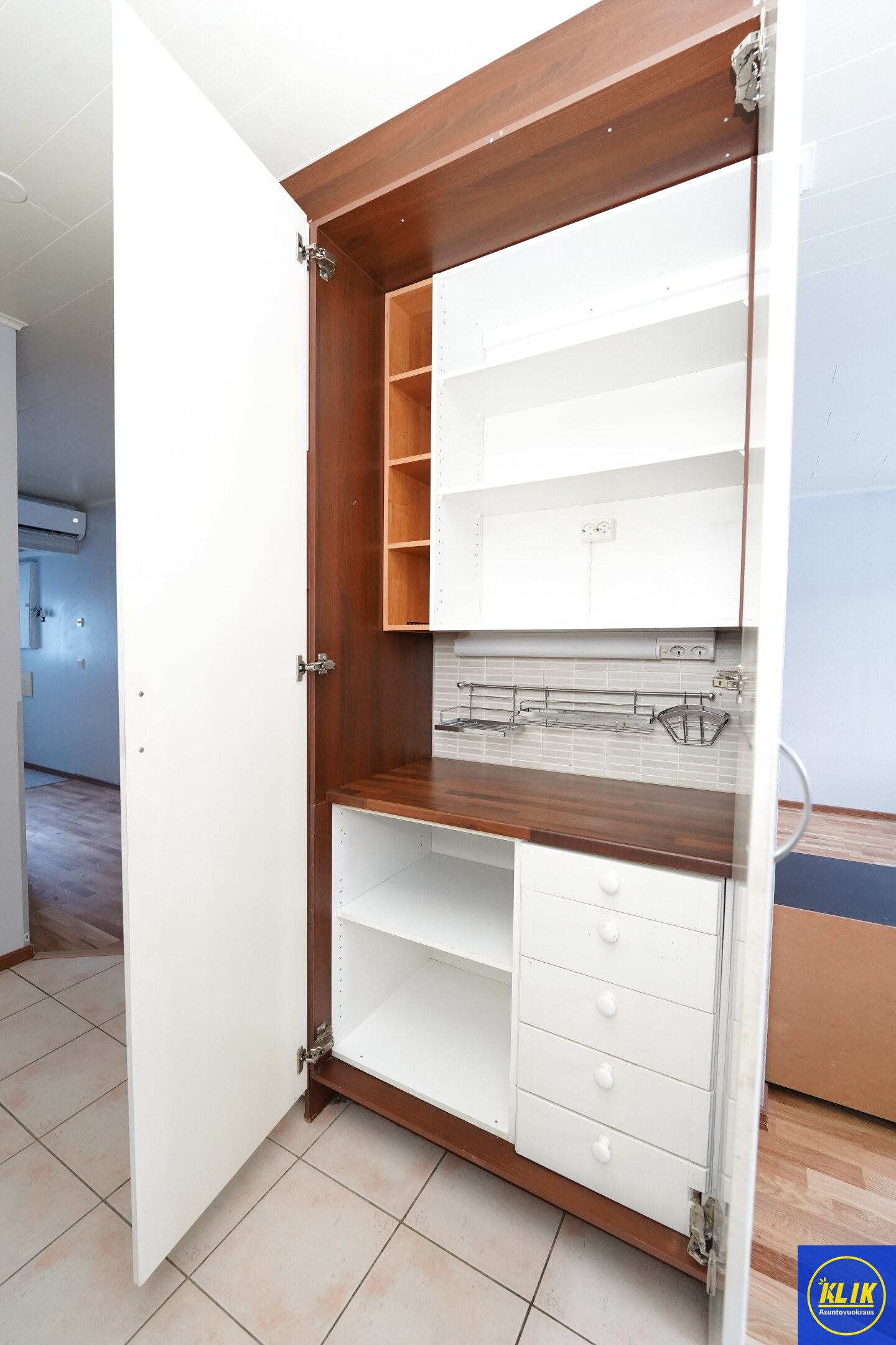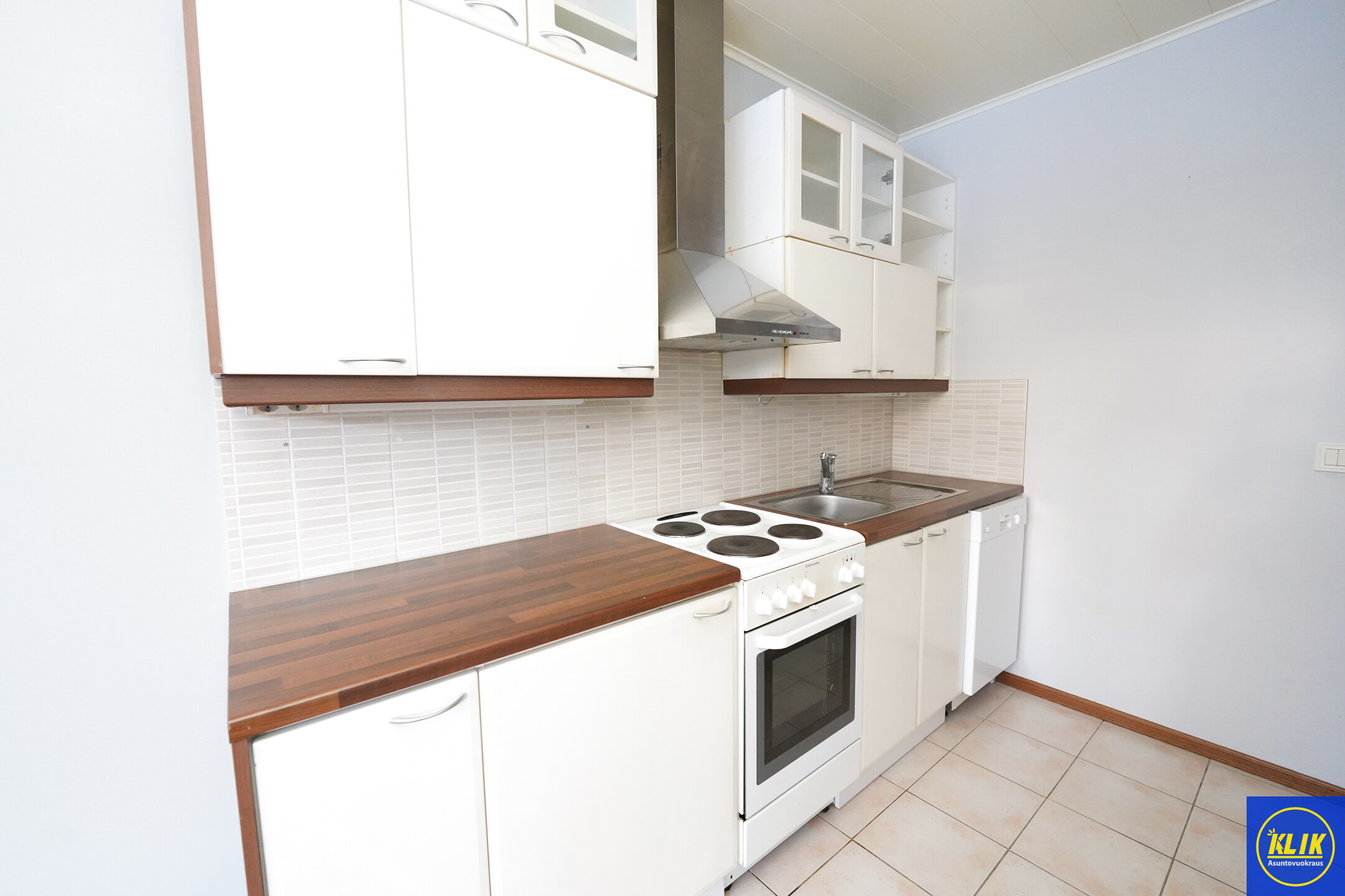 erillinen keittiölaminaattitasot keittiössä, sähköliesi; liesituuletin, astianpesukone (45cm), jenkkikaappi,