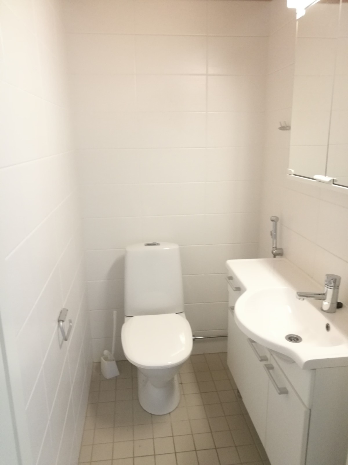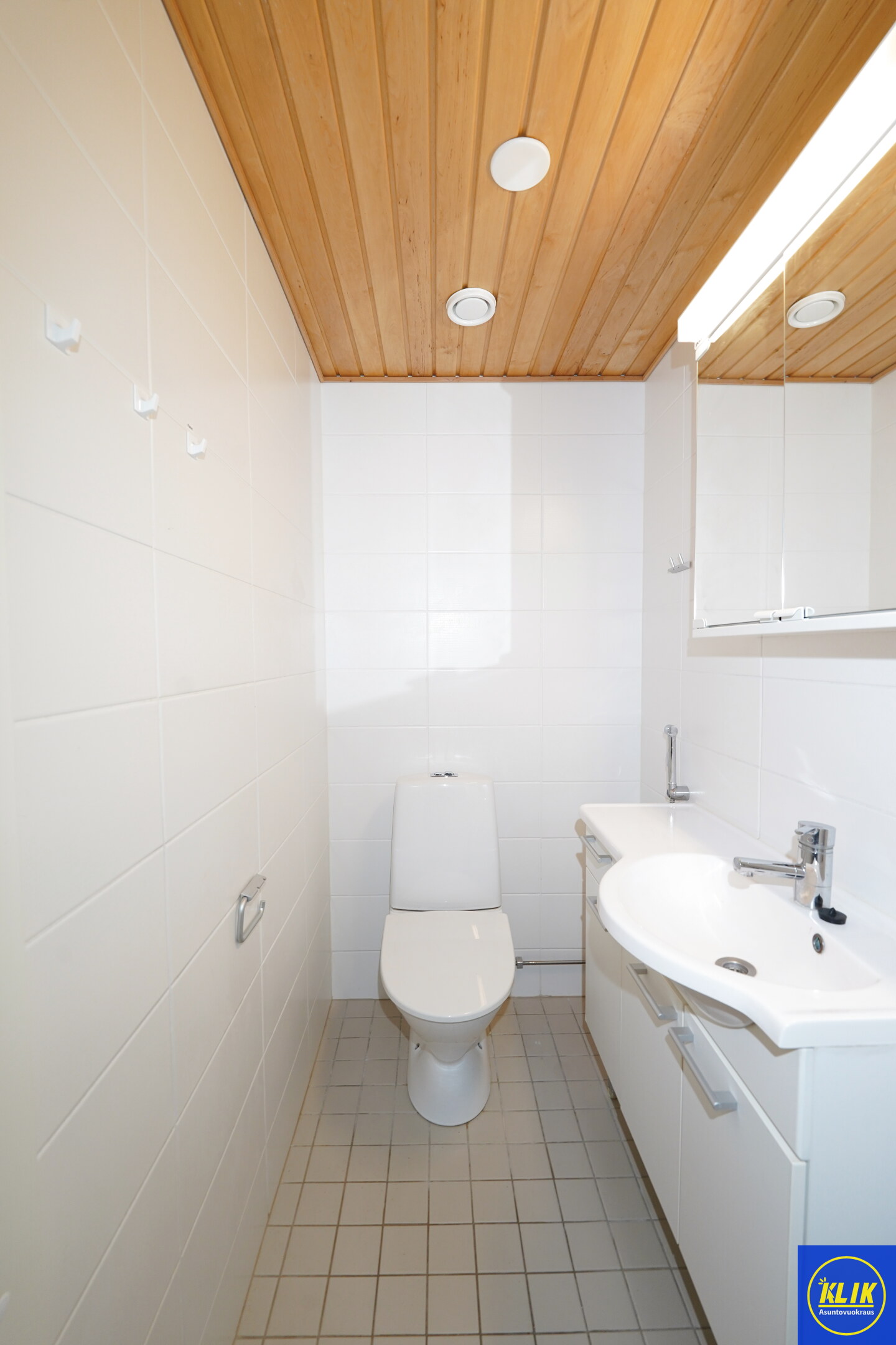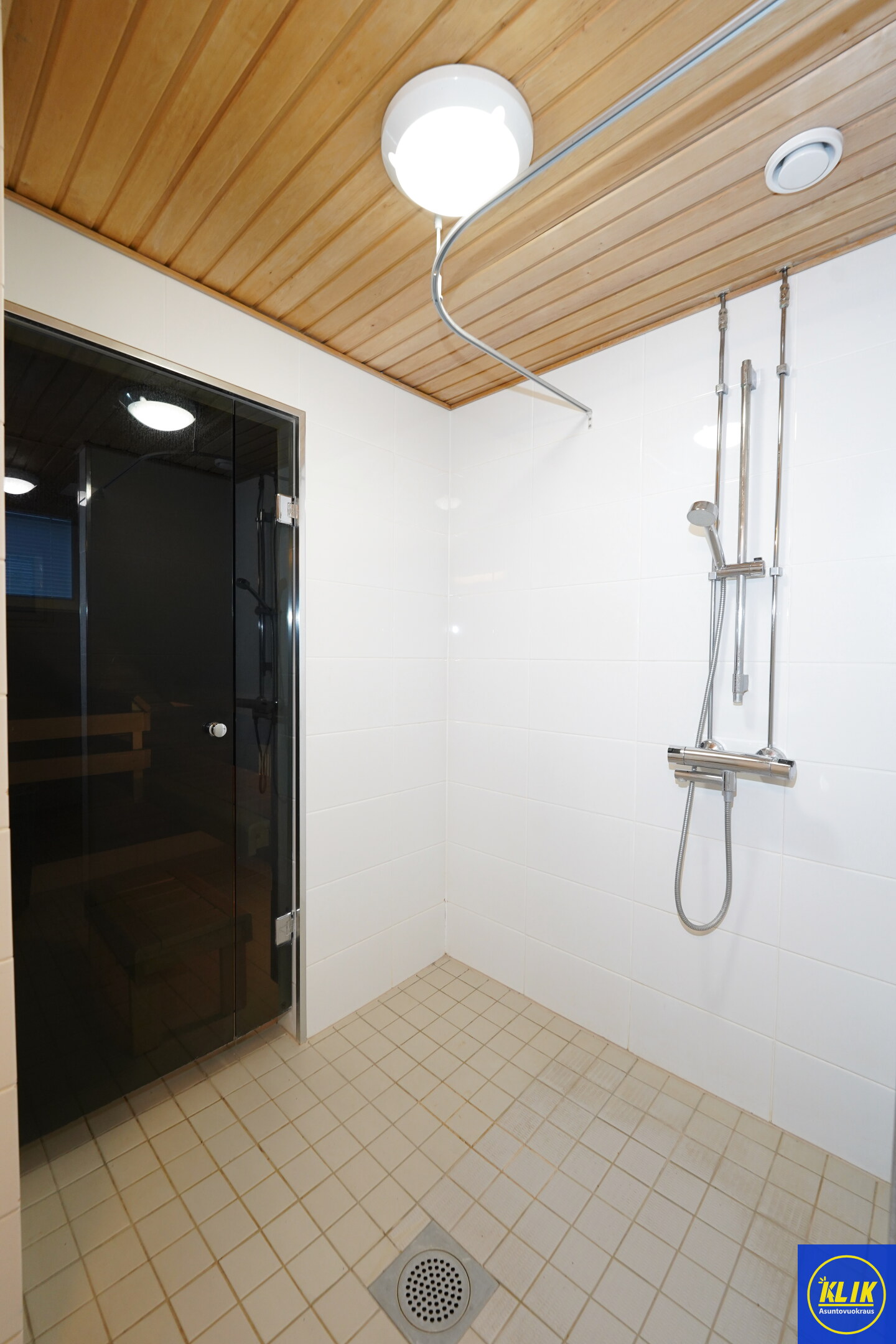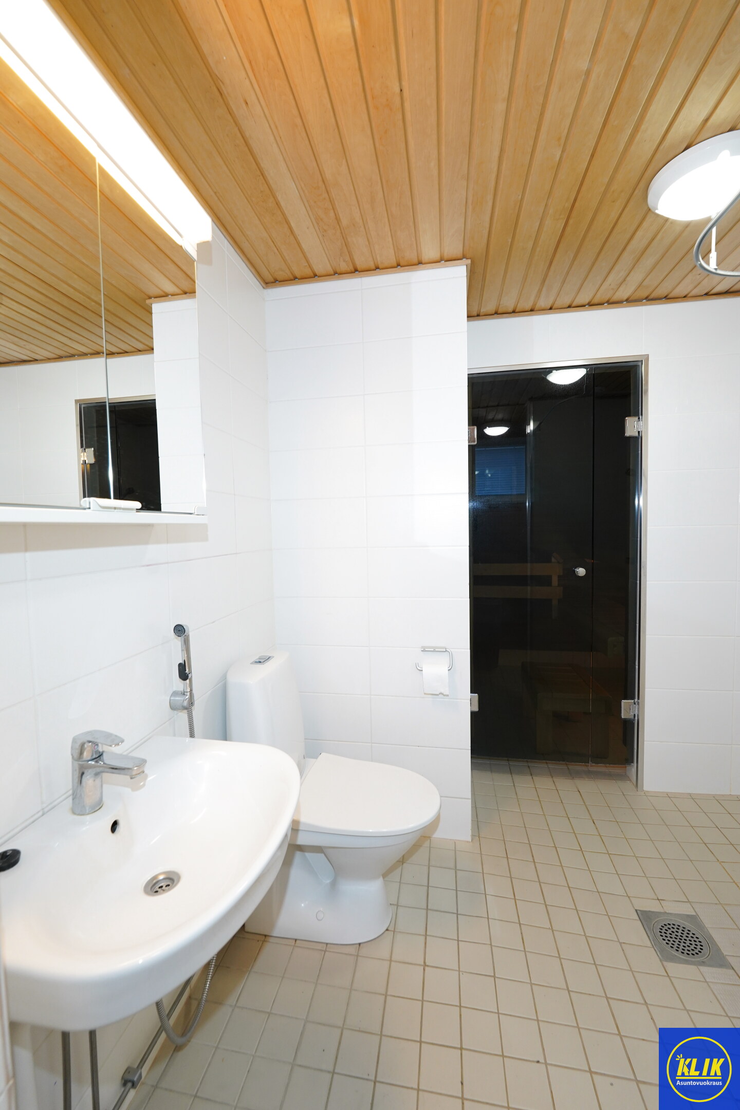 laattalattia; laattaseinä, myös erillinen WC, allaskaappi; peilikaappi; muuta säilytystilaa WC:ssä, suihku, pesukonevalmius, lattialämmitys; sauna