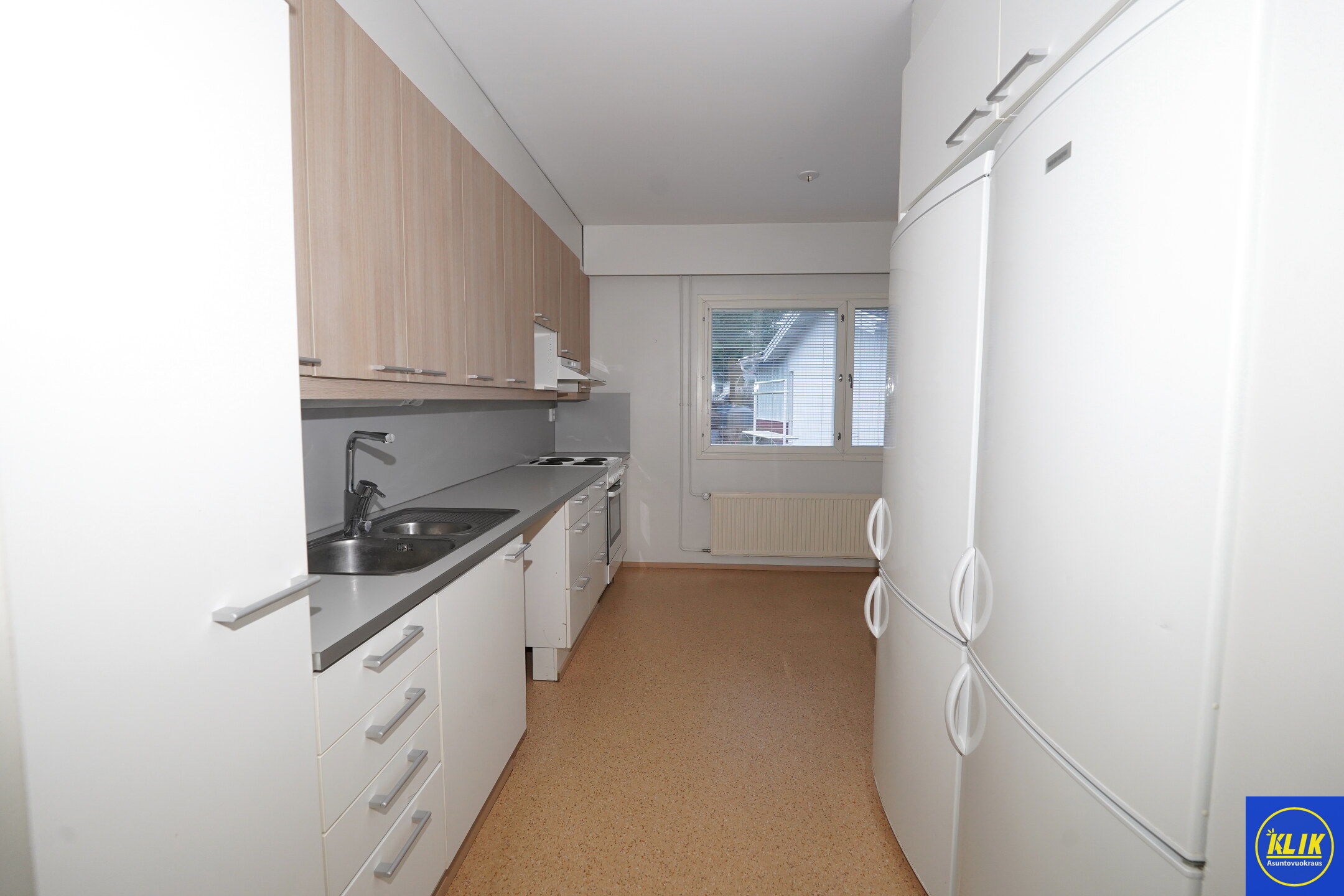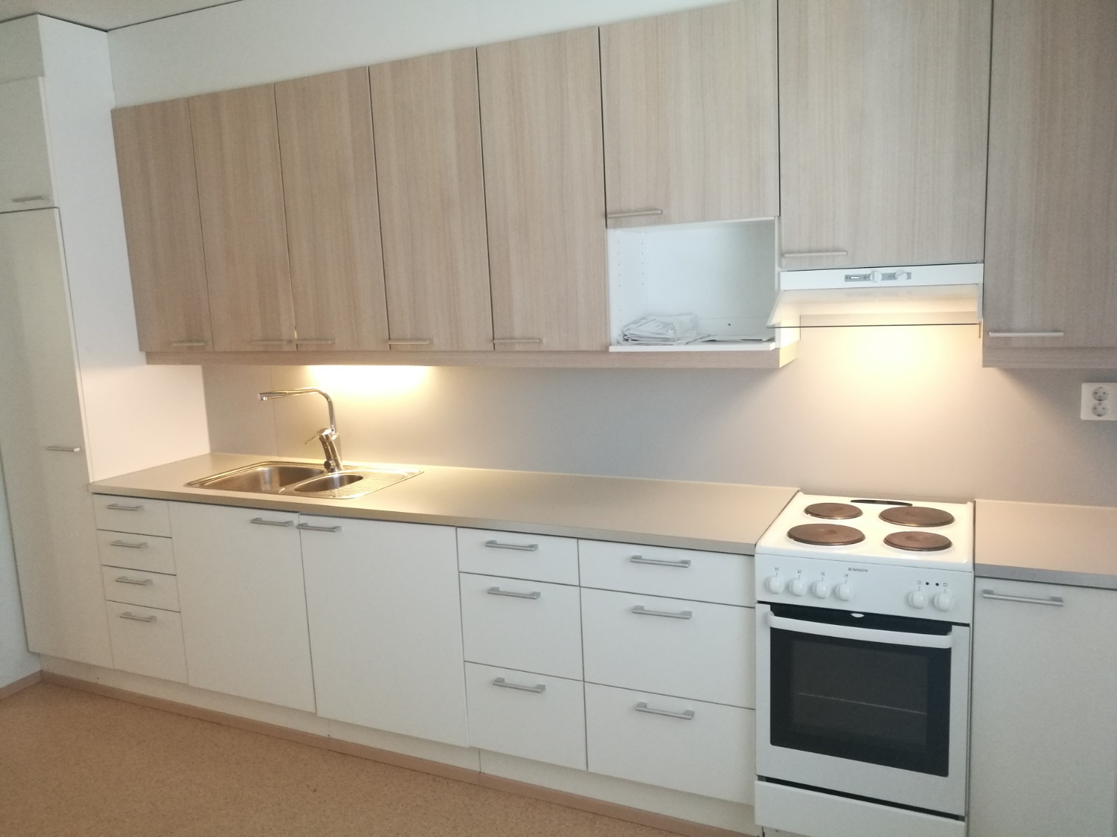 erillinen keittiölaminaattitasot keittiössä, sähköliesi; liesituuletin, pesukoneliitos, jääkaappipakastin, tilaa isolle ruokapöydälle; paljon kaappitilaa; paljon työskentelytilaa