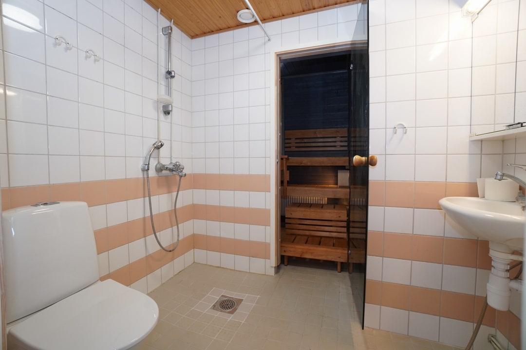 laattalattia; laattaseinä, peilikaappi, suihku, pesukonevalmius, lattialämmitys; sauna