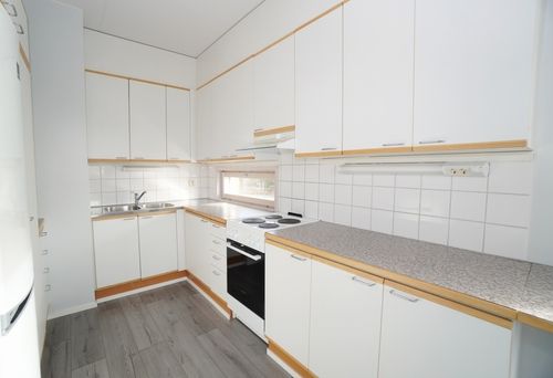 avokeittiö, terästasot keittiössä; laminaattitasot keittiössä, sähköliesi; liesituuletin, pesukoneliitos, jääkaappipakastin, tilaa isolle ruokapöydälle; paljon kaappitilaa; paljon työskentelytilaa; suuri tiskipöytä