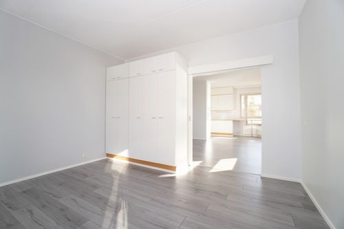 Keittiö ja olohuone ovat reilun kokoisia. Tilavasta olohuoneesta on käynti parvekkeelle. Parvekkeella on erillinen irtaimistovarasto. Molemmat makuuhuoneet ovat hyvän kokoisia ja makuuhuoneissa on hyvin säilytystilaa kaappien muodossa. Koko asuntoon on vaihdettu kaunis harmaa laminaatti ja seinät on maalattu.