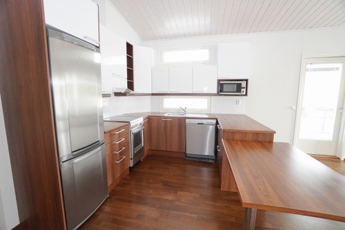 avokeittiö, laminaattitasot keittiössä, keraaminen- tai induktioliesi; liesituuletin, astianpesukone (60cm), jääkaappipakastin, tilaa isolle ruokapöydälle; paljon kaappitilaa; paljon työskentelytilaa; mikro valmiina keittiössä; mikrohylly