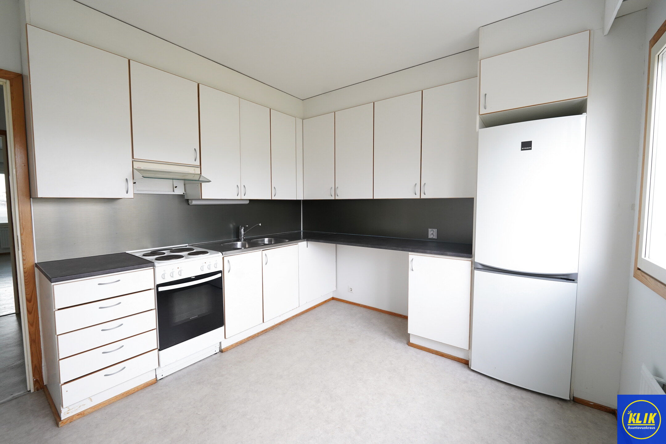 erillinen keittiöterästasot keittiössä; laminaattitasot keittiössä, sähköliesi; liesituuletin, , jääkaappipakastin, tilaa isolle ruokapöydälle; paljon kaappitilaa; paljon työskentelytilaa; suuri tiskipöytä