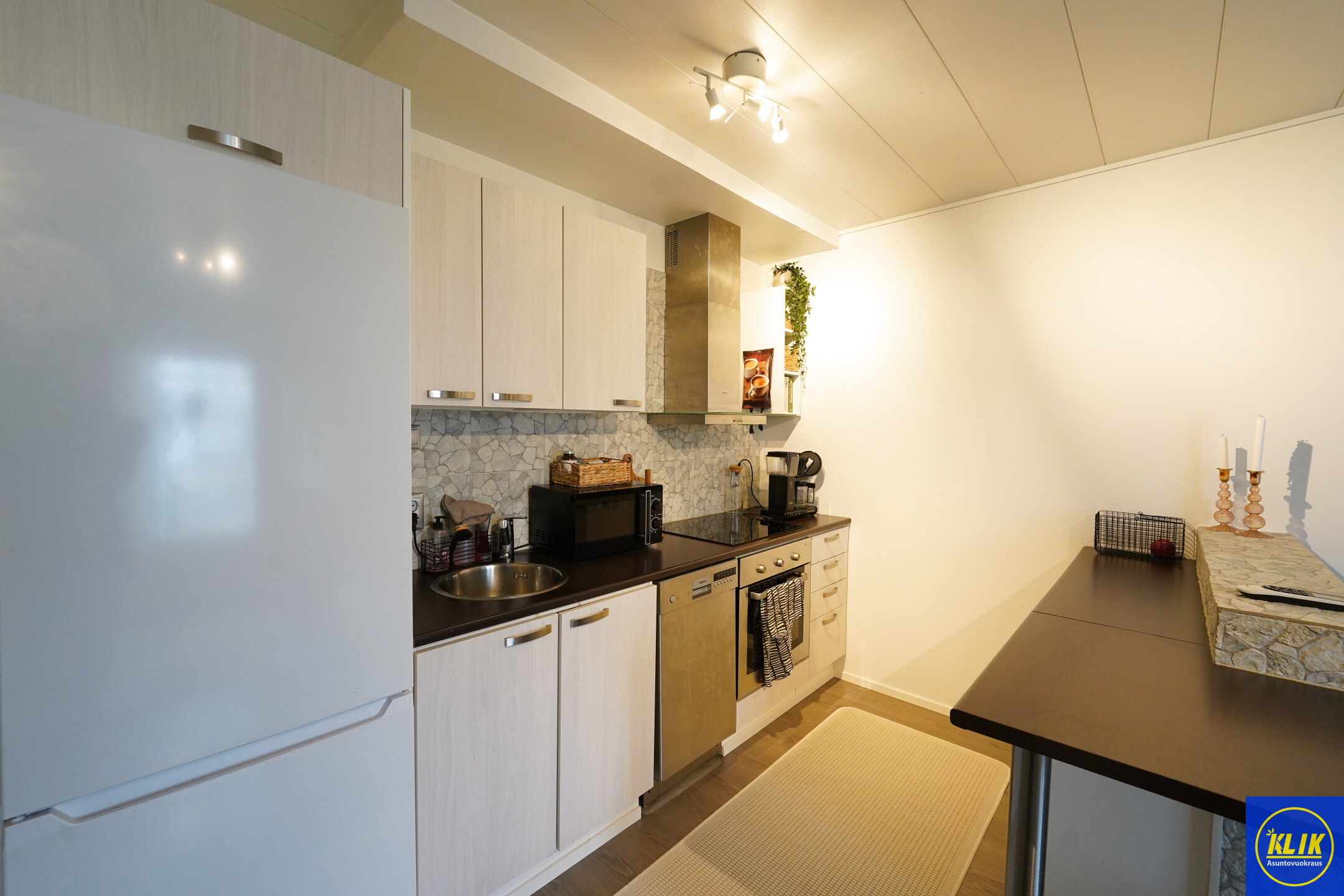avokeittiölaminaattitasot keittiössä, keraaminen- tai induktioliesi; liesituuletin, astianpesukone (45cm), jääkaappipakastin, tilaa isolle ruokapöydälle
