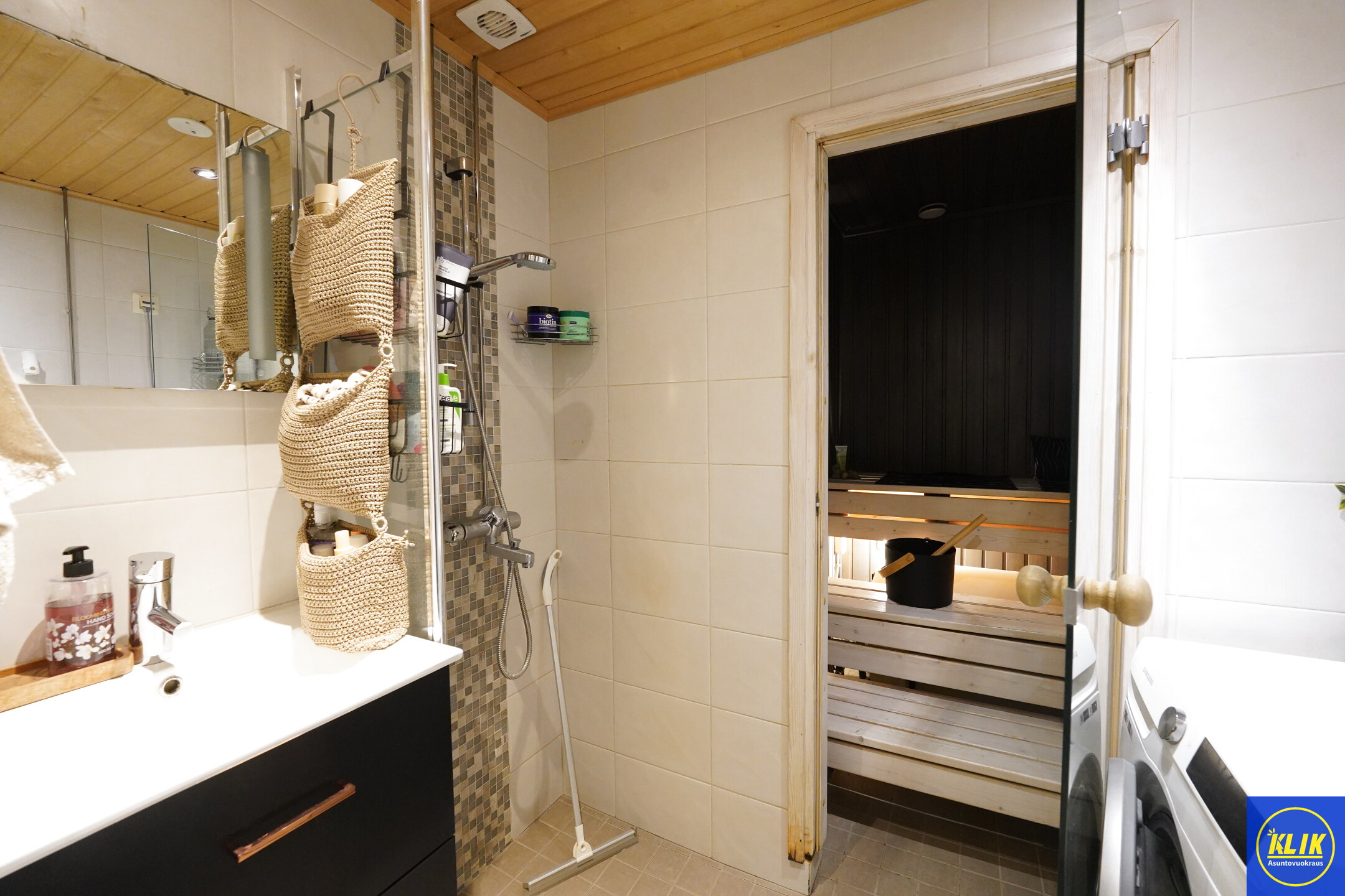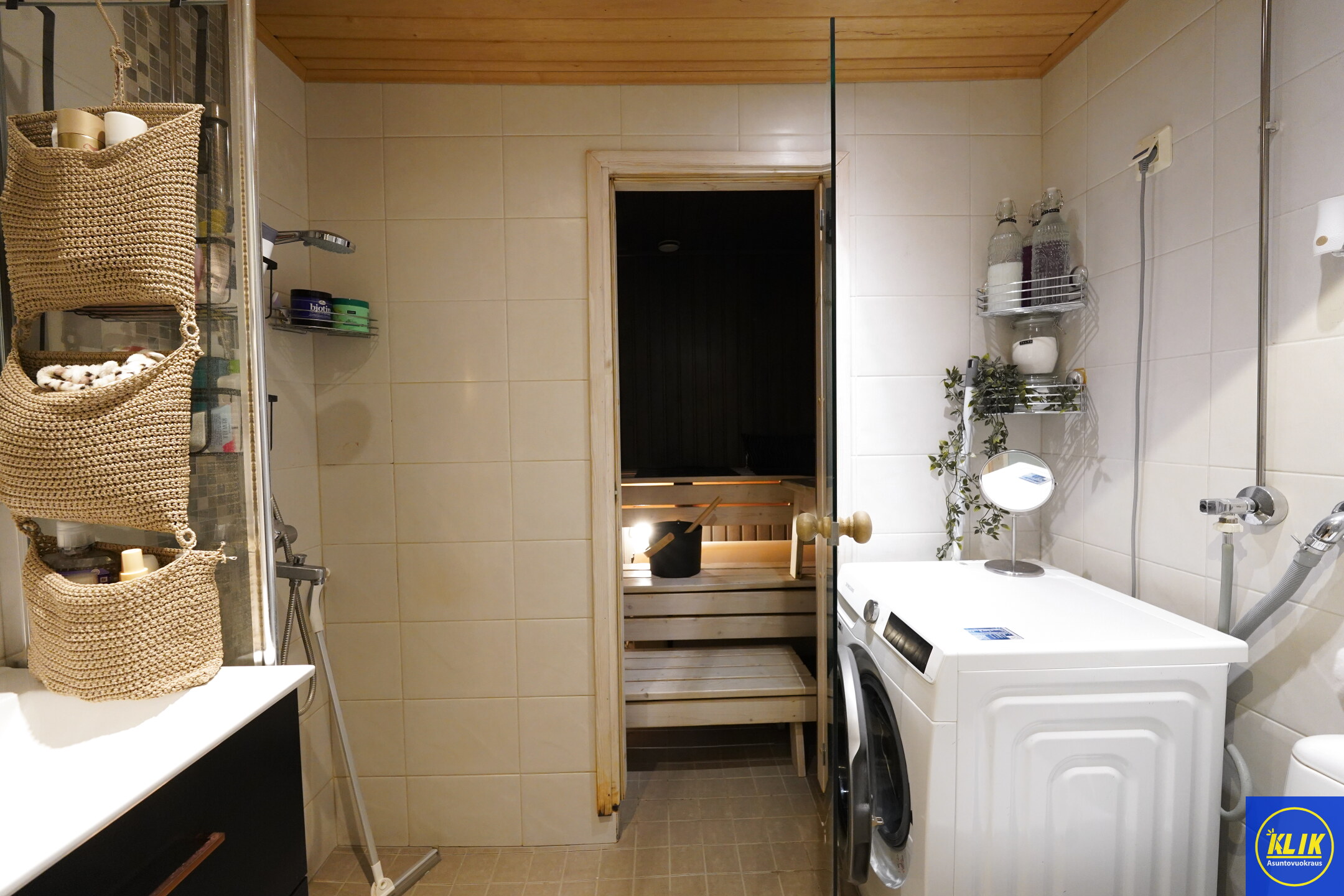 laattalattia; laattaseinä, , allaskaappi, suihku; suihkuseinä, , pesukonevalmius, kylpyhuoneessa lattialämmitys; oma sauna