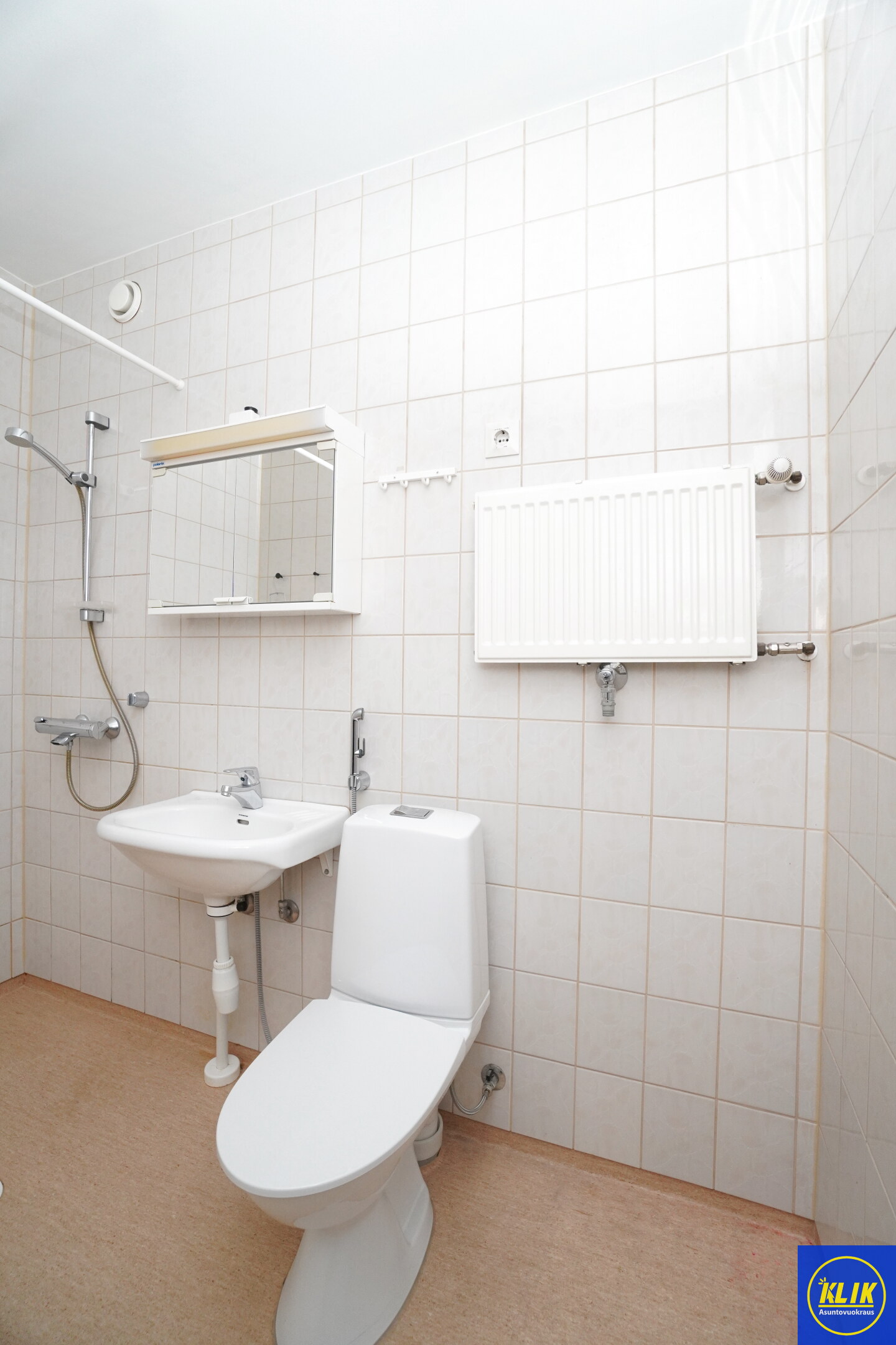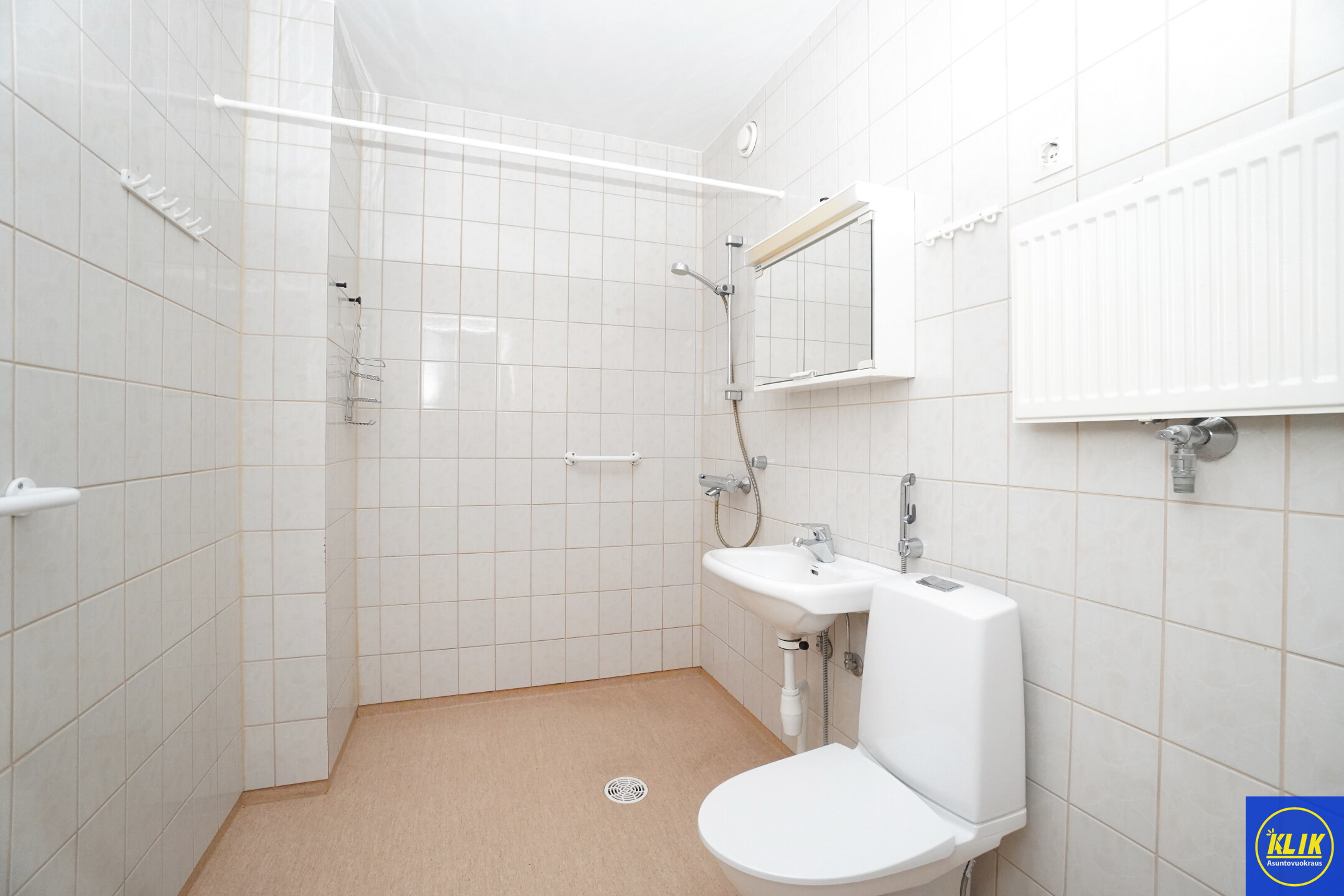 muovimatto; laattaseinä, , peilikaappi, suihku, , pesukonevalmius, taloyhtiössä sauna