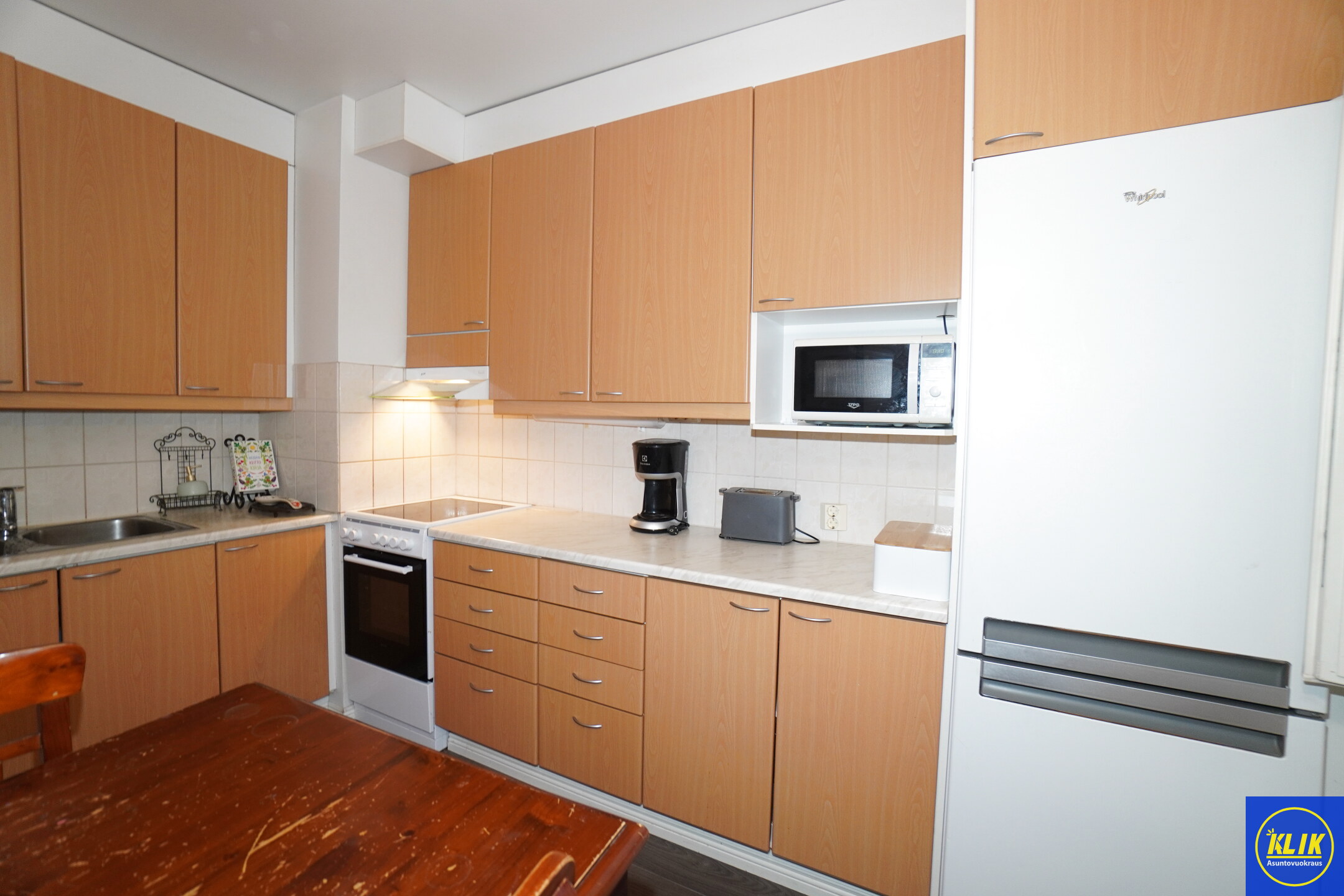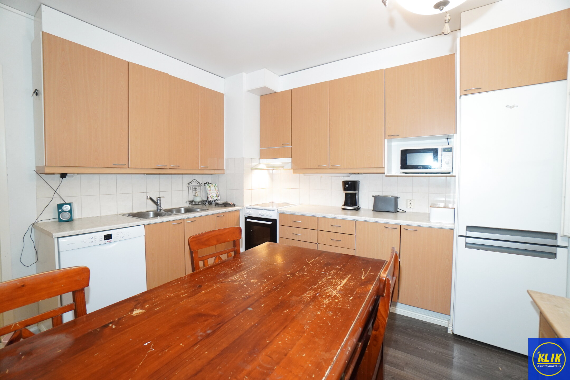 erillinen keittiölaminaattitasot keittiössä, keraaminen- tai induktioliesi; liesituuletin, astianpesukone (60cm), jääkaappipakastin, tilaa isolle ruokapöydälle; paljon kaappitilaa; paljon työskentelytilaa; mikrohylly