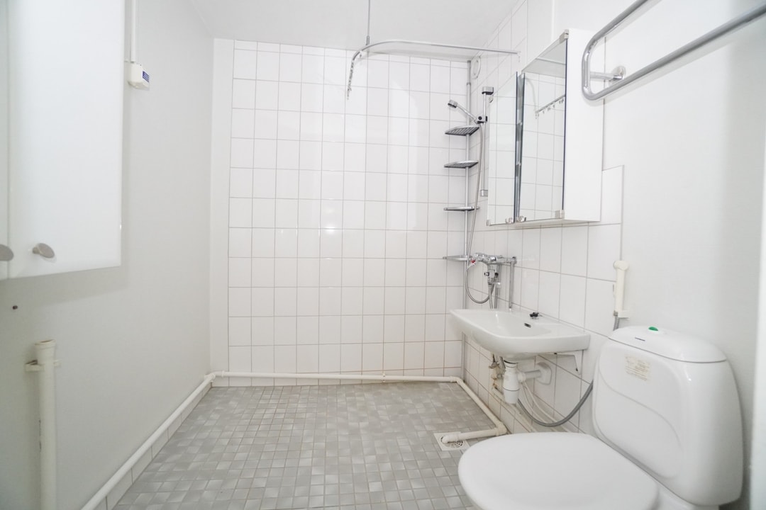 laattalattia; laattaseinä, peilikaappi; muuta säilytystilaa WC:ssä, suihku, pesukonevalmius, rättipatteri