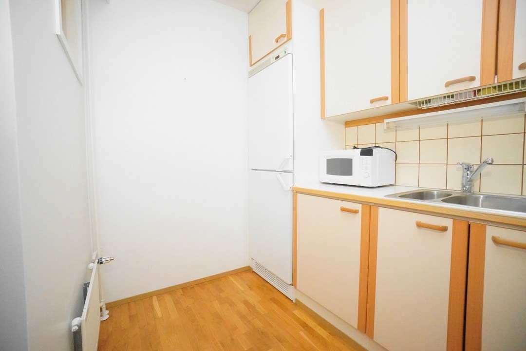 Kompaktin kokoinen asunto, jossa on kauttaaltaan parkettilattia ja vaaleat seinät. Erilliseen keittiöön mahtuu pieni ruokapöytä. Varustukseen kuuluu jääkaappipakastin, hella sekä mikro. Olohuone ja makuuhuone ovat yhtä tilaa. Asuntoon kuuluu lisäksi iso lasitettu parveke. Parvekkeella on huuva grilliä varten ja viidennestä kerroksesta on rauhalliset näkymät sisäpihalle.