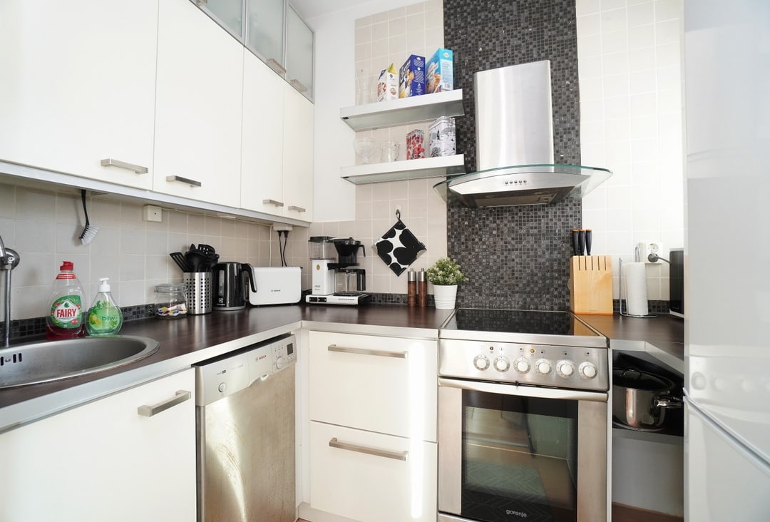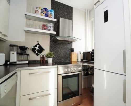 keittokomero, laminaattitasot keittiössä, keraaminen- tai induktioliesi; liesituuletin, astianpesukone (60cm), jääkaappipakastin,