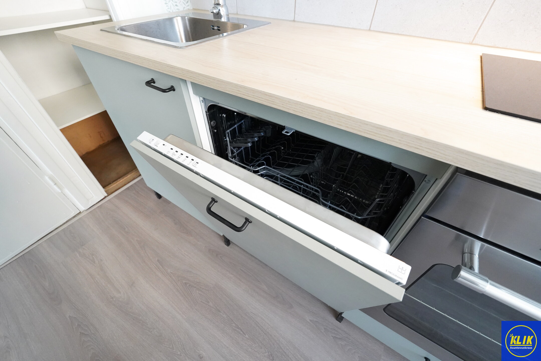 erillinen keittiölaminaattitasot keittiössä, keraaminen- tai induktioliesi; keittotaso ja kalusteuuni; liesituuletin, astianpesukone (60cm); Integroitu, jääkaappipakastin, tilaa isolle ruokapöydälle; paljon kaappitilaa; paljon työskentelytilaa