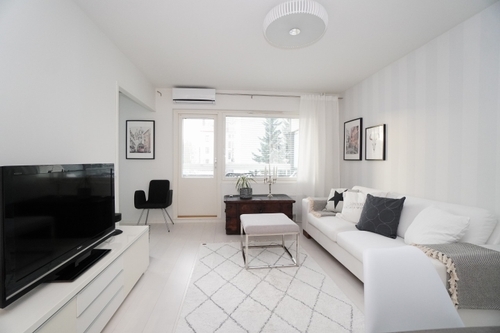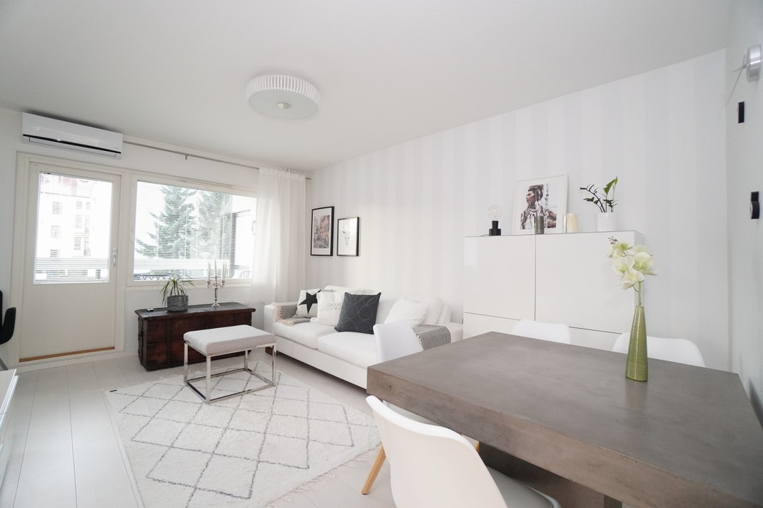 Olohuoneen kautta on kulku lasitetulle parvekkeelle, josta on näkymä sisäpihan suuntaan. Olohuoneessa on isona plussana ilmalämpöpumppu.