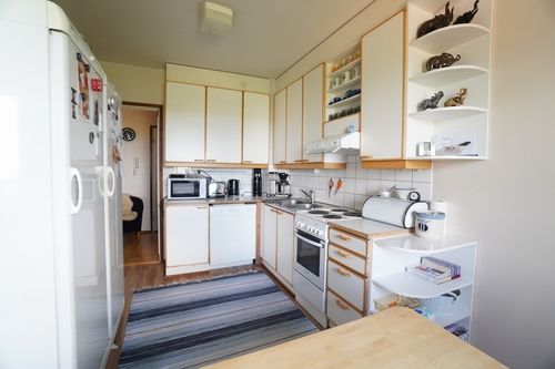 erillinen keittiö, terästasot keittiössä; laminaattitasot keittiössä, sähköliesi; liesituuletin, astianpesukone (60cm), jääkaappi; pakastin, tilaa isolle ruokapöydälle; paljon kaappitilaa; paljon työskentelytilaa; suuri tiskipöytä