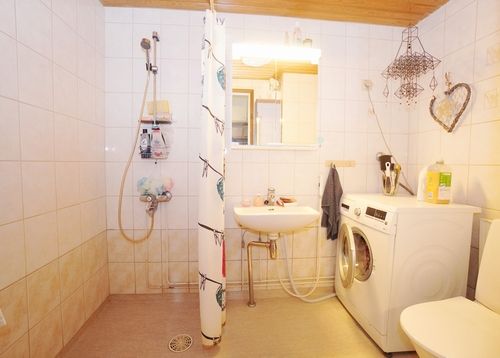 Kylpyhuoneessa on hyvä paikka vaikka pesutornille ja tilan yhteydessä on oma sauna.