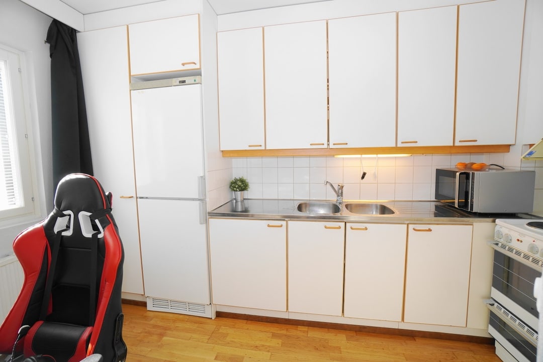 erillinen keittiö, terästasot keittiössä; laminaattitasot keittiössä, sähköliesi; liesituuletin, jääkaappipakastin, paljon kaappitilaa; paljon työskentelytilaa; suuri tiskipöytä