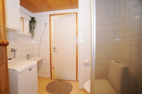 Tilavassa kylpyhuoneessa hyvin tilaa suuremmallekin pesukoneelle ja kokonaisuuden kruunaa oma sauna.