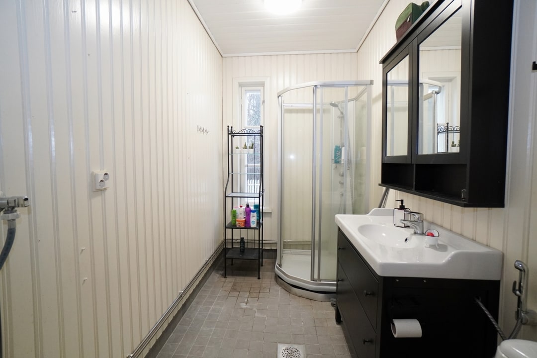Kylpyhuoneessa on liitännät pyykinpesukoneelle ja hyväkuntoiset kalusteet.