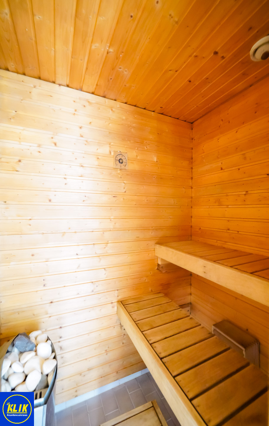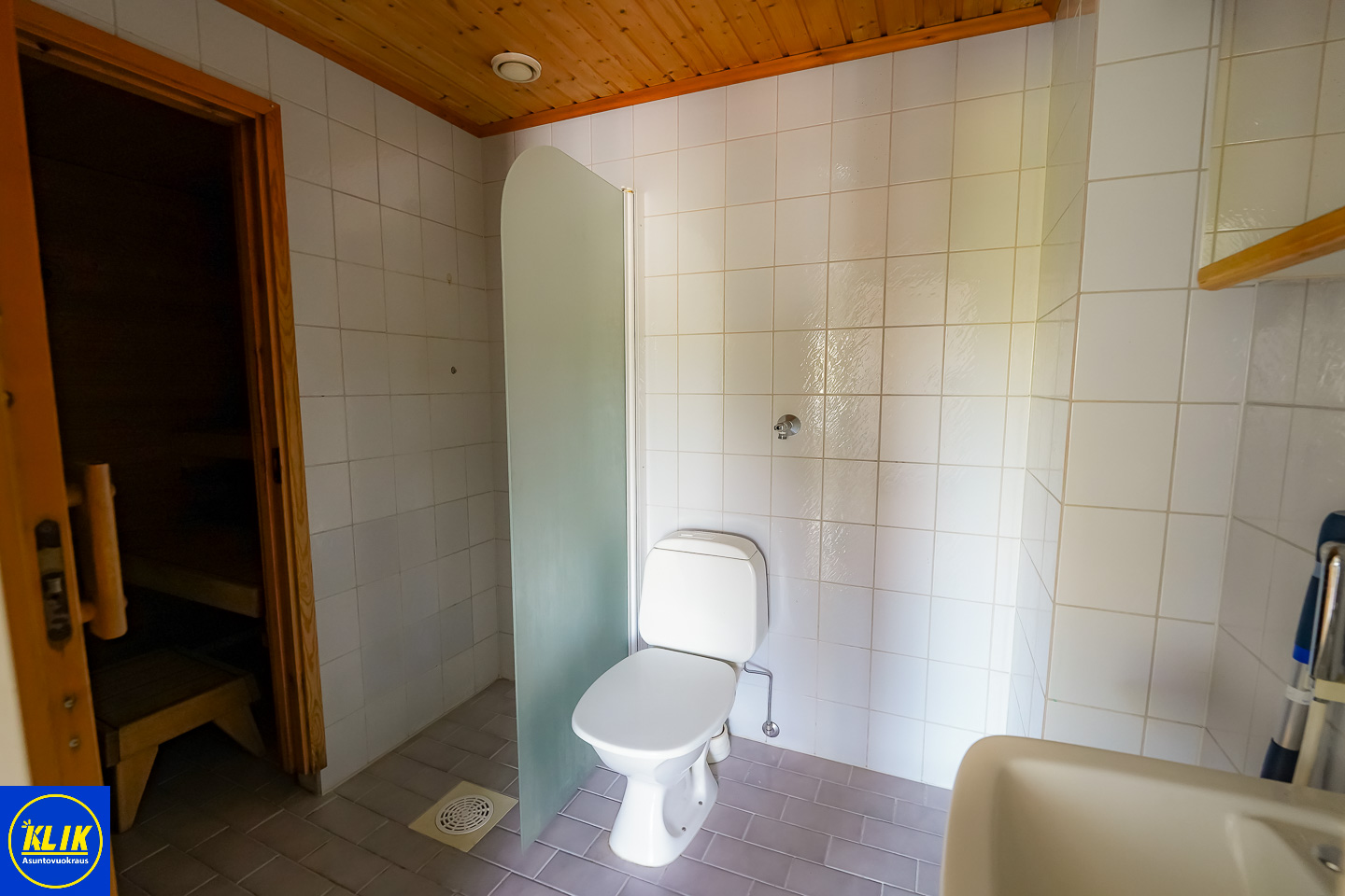 laattalattia; laattaseinä, peilikaappi, suihku; suihkuseinä, pesukonevalmius, oma sauna