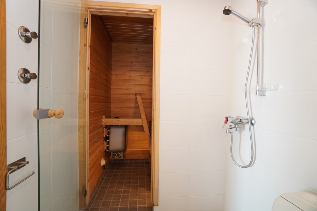 Laatoitetussa kylpyhuoneessa on oma paikka pyykinpesukoneelle. Oman saunan ansiosta voit löylytellä aina kun sinulle sopii!