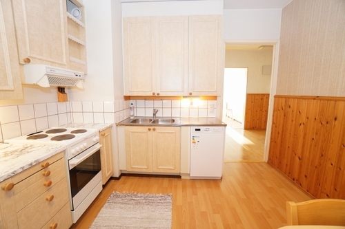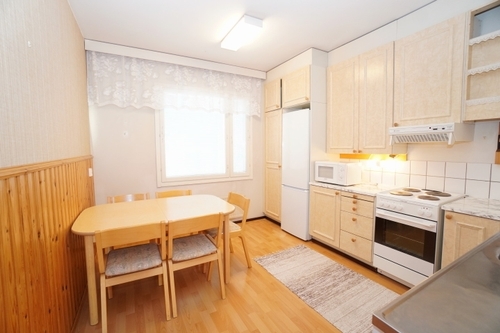 erillinen keittiö, terästasot keittiössä; laminaattitasot keittiössä, sähköliesi; liesituuletin, jääkaappipakastin, tilaa isolle ruokapöydälle; paljon kaappitilaa; paljon työskentelytilaa