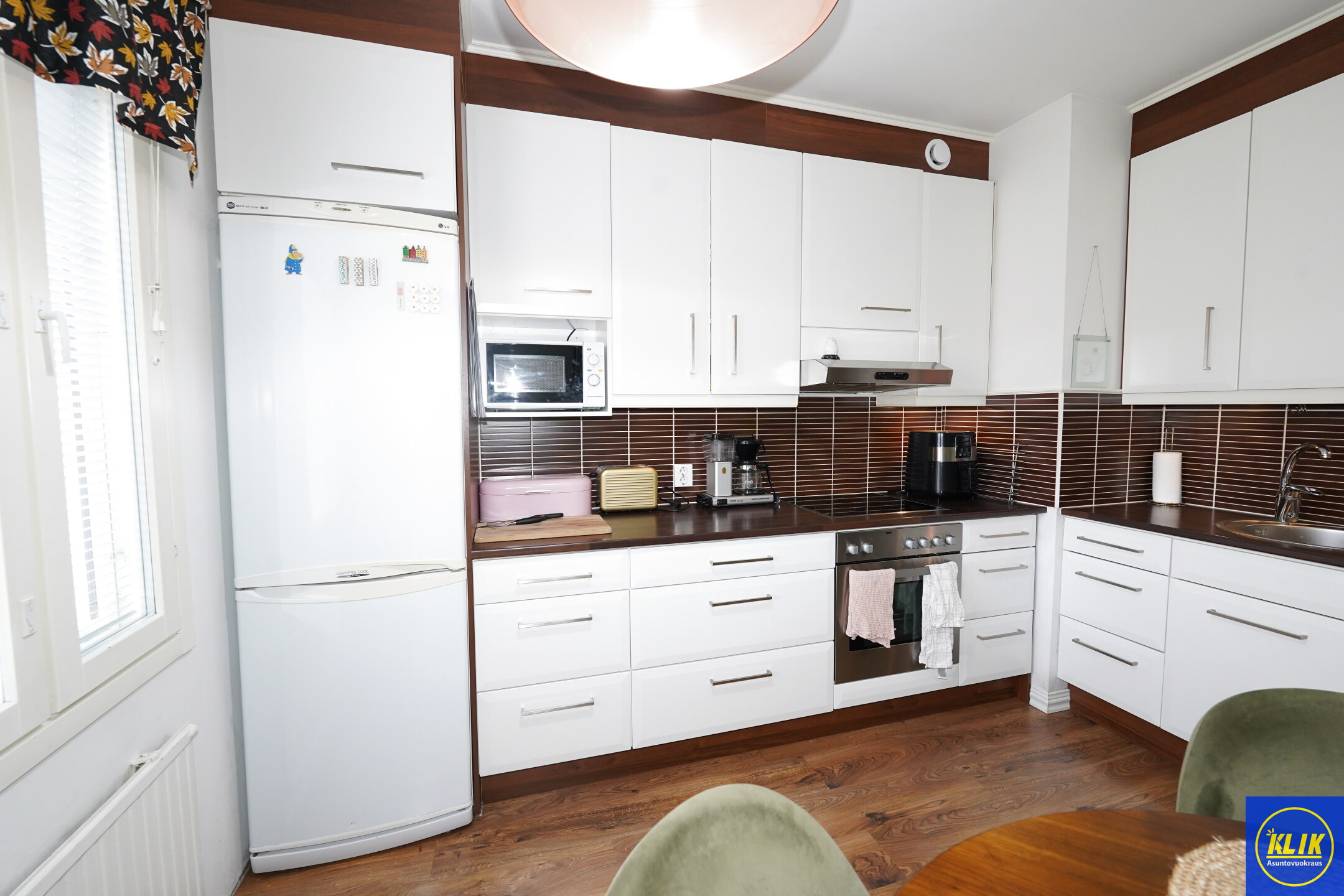 erillinen keittiölaminaattitasot keittiössä, keraaminen- tai induktioliesi; keittotaso ja kalusteuuni; liesituuletin, astianpesukone (60cm), jääkaappipakastin, tilaa isolle ruokapöydälle; paljon kaappitilaa; paljon työskentelytilaa; mikrohylly