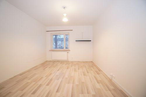 Asunnossa on laminaattilattia ja todella siistit seinäpinnat. Olohuone on sen verran tilava, että sen yhteyteen saa tarvittavat huonekalut ja sänky mahtuu tilan toiseen päähän.