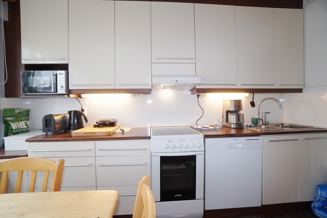 Lisäksi keittiössä on hyvin tilaa ruokaryhmälle. Mikro on valmiina uudelle asukkaalle.