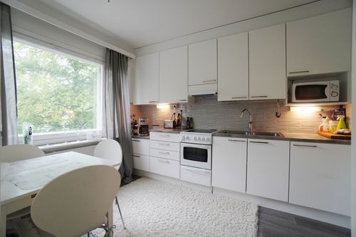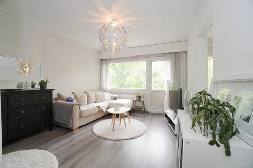 Asunnon seinät on maalattu ja lattiassa on harmaan sävyinen laminaatti. Olohuoneen yhteydessä on ranskalainen parveke kadulle päin. Alkoviin saat vaivatta parisängyn ja huone itsessään on tilava. Eteinen on suuri ja siellä onkin hyvin kaappitilaa säilytykseen.