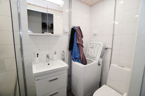Kylpyhuoneessa on selkeä paikka pesukoneelle ja uutta vastaavat kylpyhuone kalusteet.