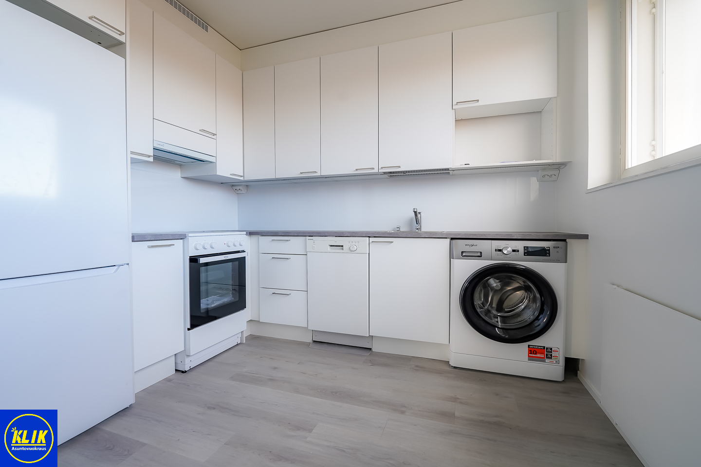erillinen keittiölaminaattitasot keittiössä, keraaminen- tai induktioliesi; liesituuletin, astianpesukone (45cm), jääkaappipakastin, tilaa isolle ruokapöydälle; paljon kaappitilaa; paljon työskentelytilaa; mikrohylly