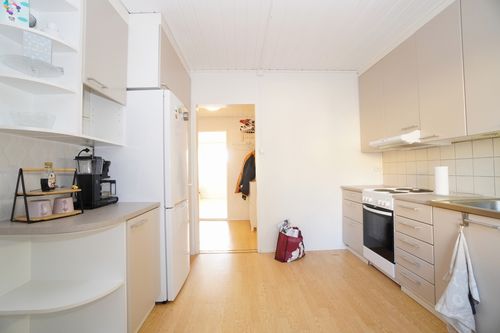 Kodinkoneet ovat hyväkuntoisia ja tilaan mahtuu vaivatta ruokailuryhmä.