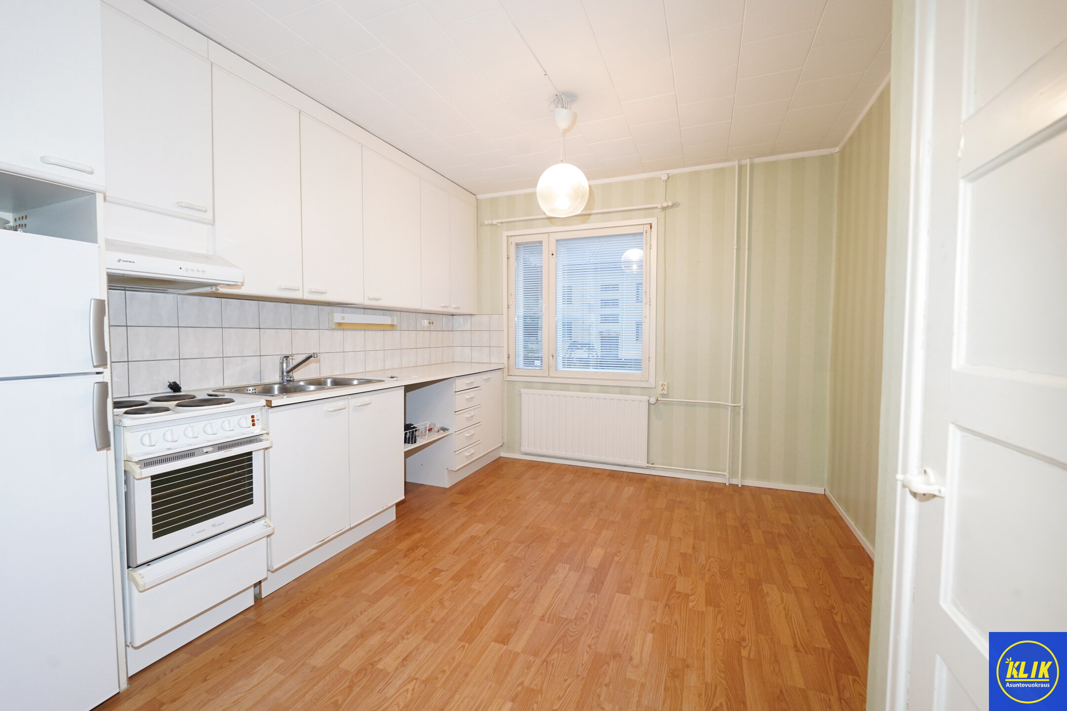 erillinen keittiölaminaattitasot keittiössä, sähköliesi; liesituuletin, , jenkkikaappi, tilaa isolle ruokapöydälle; paljon kaappitilaa; paljon työskentelytilaa