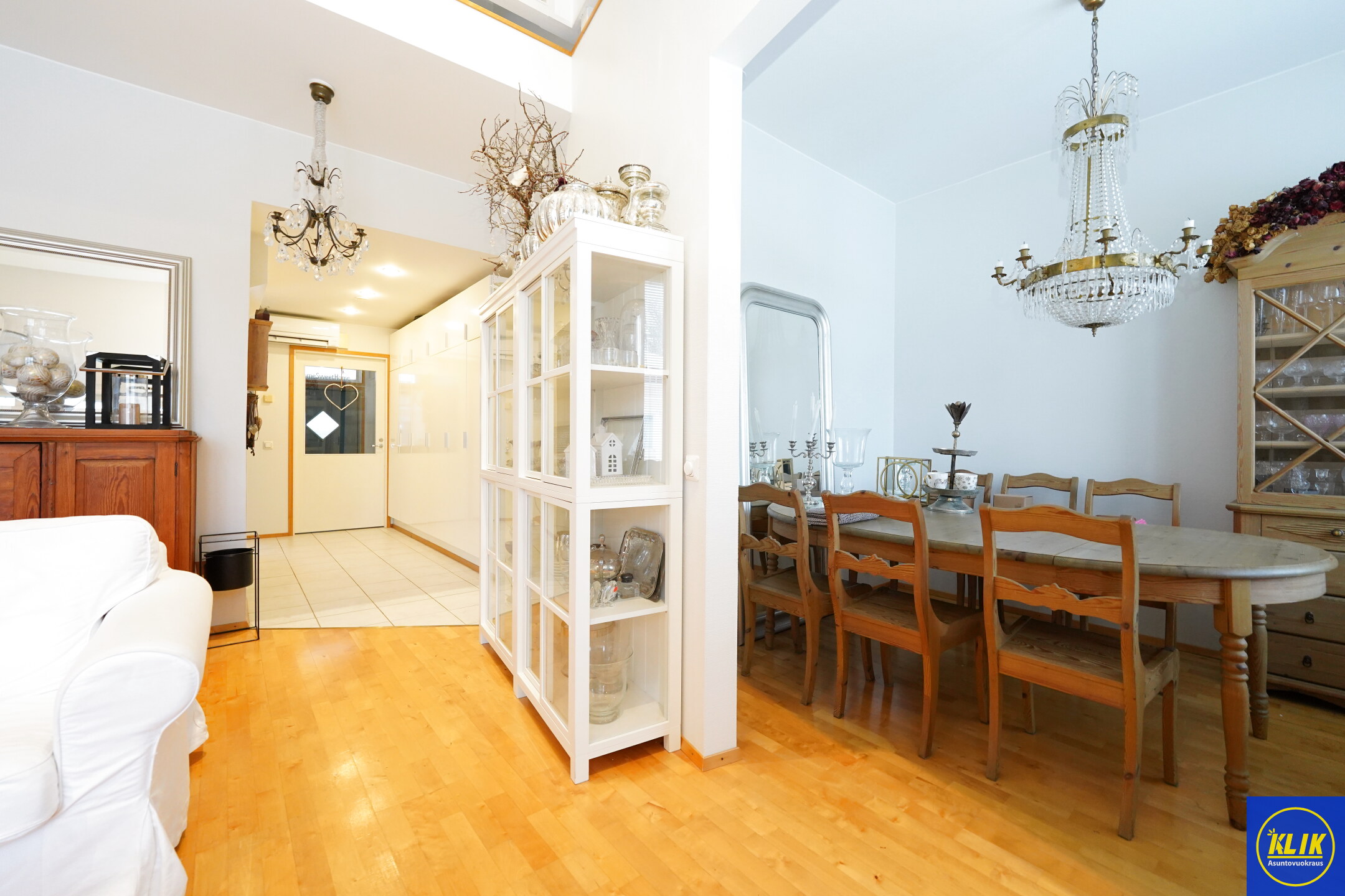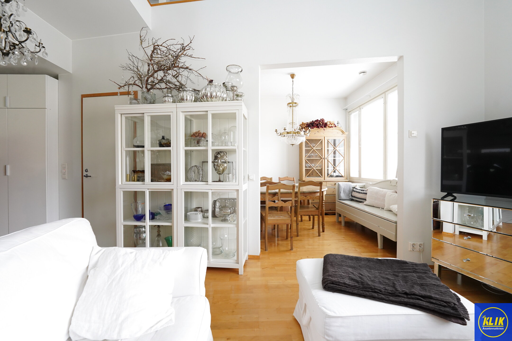Keskikerros: Sisäänkäynnin yhteydessä on eteinen kaapistoineen sekä olohuone, josta on käynti ruokailutilaan ja erillinen keittiö. Kauniit parkettilattiat, reilu huonekorkeus ja suurista ikkunoista tulviva valo luovat avaran tunnelman.