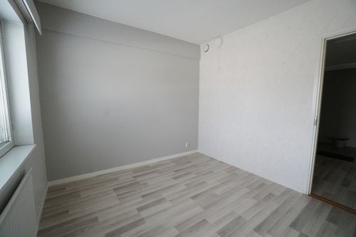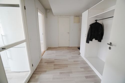 Makuuhuoneessa jatkuu sama valkoisen ja harmaan värimaailma, joka hallitsee muuallakin asunnossa. Tähän kotiin on lisäksi vaihdettu kaunis yhtenäinen laminaatti, joka jatkuu läpi asunnon. Eteisessä on runsaasti säilytystilaa kaappien muodossa. Kylpyhuone on tilava ja siellä on liitännät pesukoneelle.