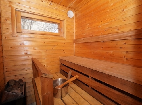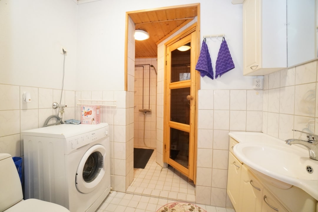 laattalattia; laattaseinä, allaskaappi, suihku, pesukonevalmius, lattialämmitys; sauna; avattava ikkuna
