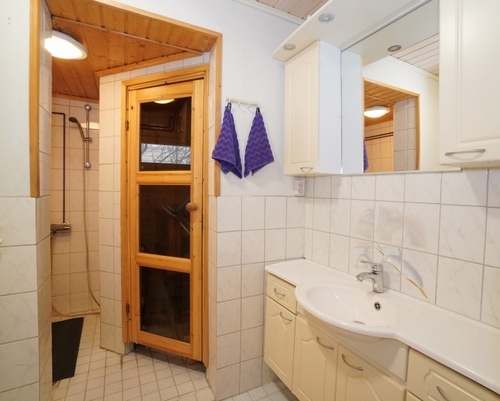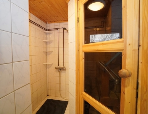 Kylpyhuone on kauttaaltaan laatoitettu ja sen yhteydessä on oma sauna.