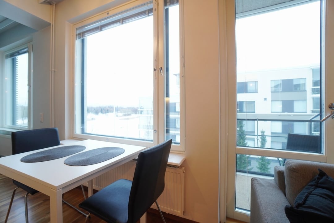 Todella hieno asunto, joka on yleisilmeeltään siisti. Keittiössä on valkoiset siistit kodinkoneet ja keittiön yhteyteen saa vaivatta ruokaryhmän. Keittiöstä näkymä olohuoneeseen, joten tila on hyvin avara ja tilavan tuntuinen.