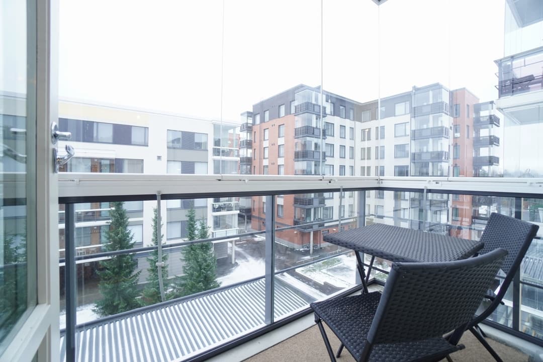Asunnossa on suuri lasitettu parveke jokinäkymällä.