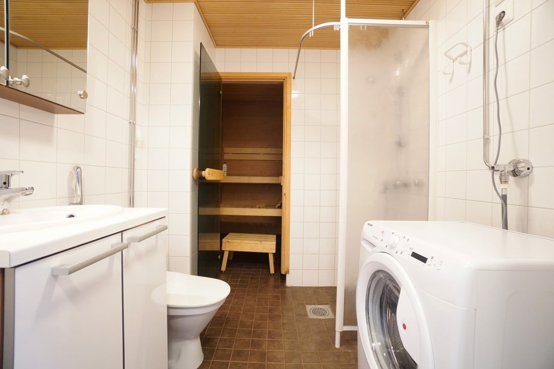 Kylpyhuoneessa on liitännät pesukoneelle. Kylpyhuoneen yhteydessä on lisäksi oma sauna!