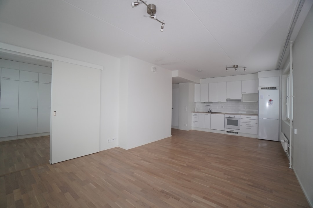 Todella hieno asunto, joka on yleisilmeeltään siisti. Lattiat on parkettia ja seinät on maalattu värimaailmaltaan vaaleiksi. Keittiössä on valkoiset uudehkot kodinkoneet ja keittiön yhteyteen saa vaivatta ruokaryhmän. Keittiöstä näkymä olohuoneeseen, joten tila on hyvin avara ja tilavan tuntuinen.