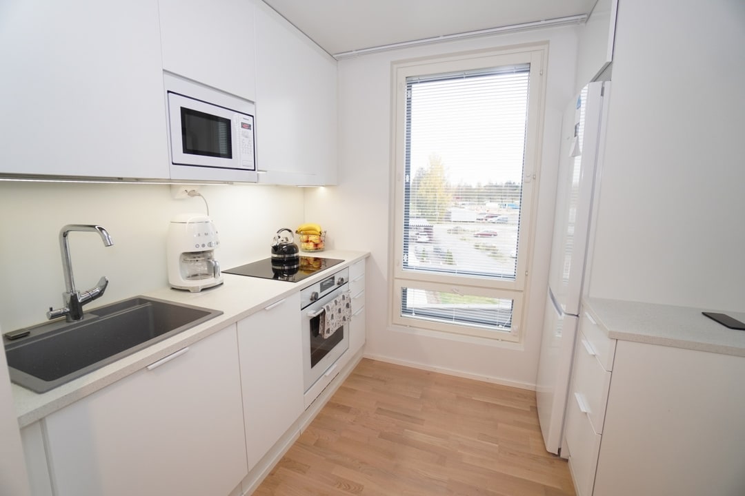 Hieno vuonna 2020 valmistunut asunto talon kolmannesta kerroksesta. Asunnossa on parkettilattiat ja maalatut seinät. Keittiön varustukseen kuuluu mm. astianpesukone. Keittiö on modernin tyylikäs kuten koko asunto. Luonnonvalo pääsee asuntoon useiden ikkunoiden kautta. Huoneeseen saa tarvittavat kalusteet hyvin ja sen yhteydessä on lasitettu parveke jokinäkymin.