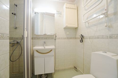 laattalattia; laattaseinä, , allaskaappi; peilikaappi, suihku; kaksi suihkua samassa kylpyhuoneessa, , pesukonevalmius, kylpyhuoneessa lattialämmitys; oma sauna