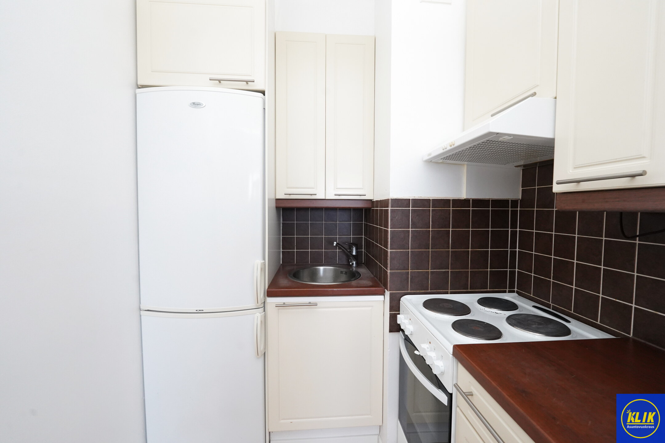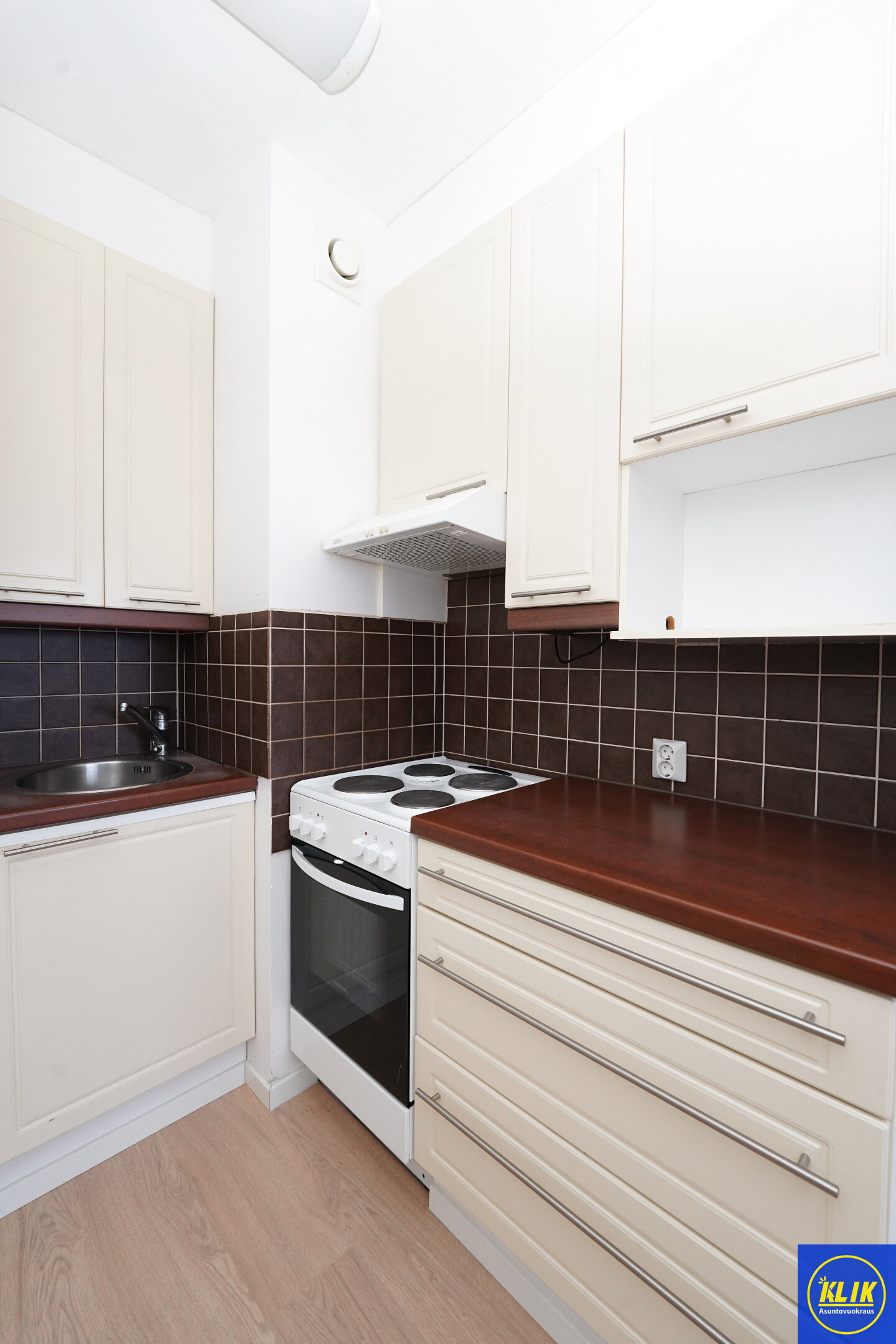 avokeittiölaminaattitasot keittiössä, sähköliesi; liesituuletin, , jääkaappipakastin, mikrohylly
