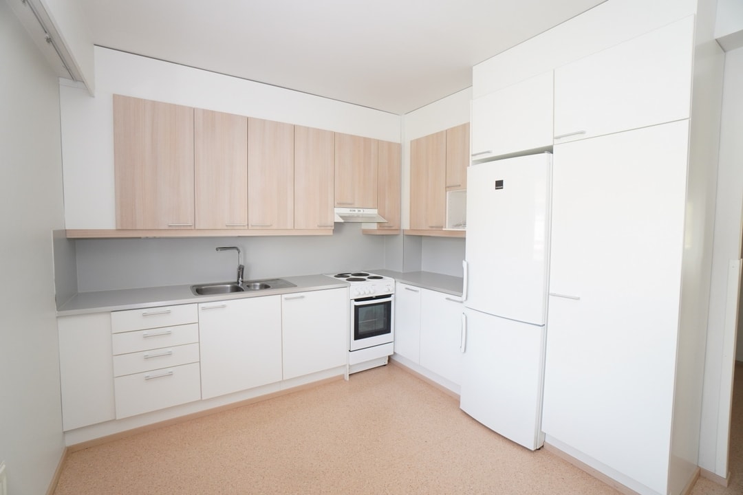erillinen keittiö, laminaattitasot keittiössä, sähköliesi; liesituuletin, pesukoneliitos, jääkaappipakastin, tilaa isolle ruokapöydälle; paljon kaappitilaa; paljon työskentelytilaa; mikrohylly