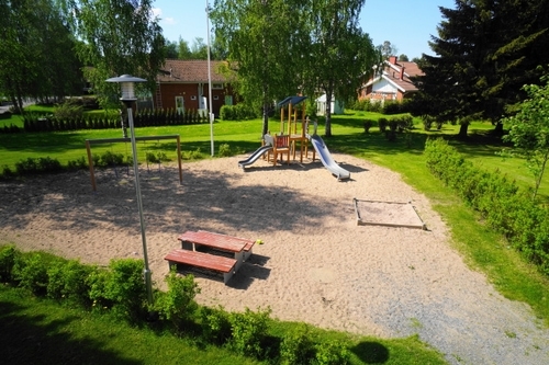 Ulkona on erillinen ulkorakennus jossa varastot. Heti pihassa kiva leikkipaikka lapsille!