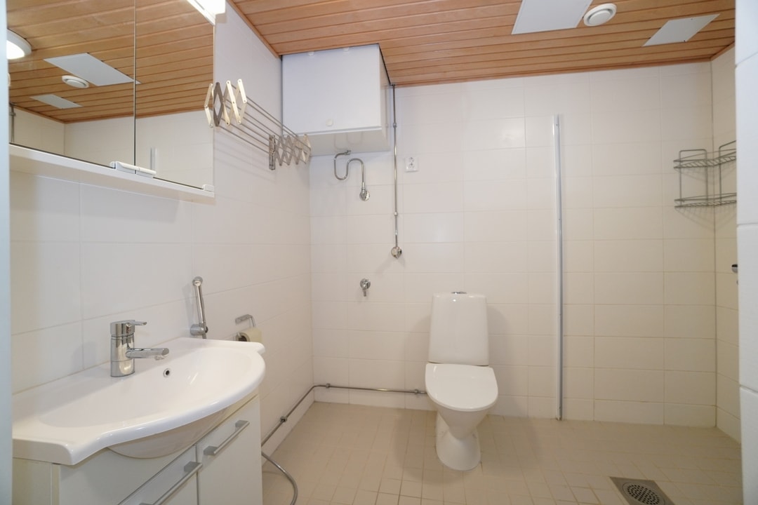 laattalattia; laattaseinä, myös erillinen WC, allaskaappi; peilikaappi; muuta säilytystilaa WC:ssä, suihku, pesukonevalmius, lattialämmitys; sauna; avattava ikkuna
