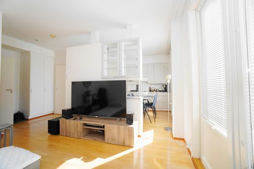 Olohuoneesta kulku hulppean kokoiselle lasitetulle parvekkeelle rauhallisen sisäpihan suuntaan. Makuuhuone on tilava ja asunnossa on säilytystä varten erillinen vaatehuone. Koko asunnossa on kaunis parkettilattia ja seinät on maalattu/tapetoitu.