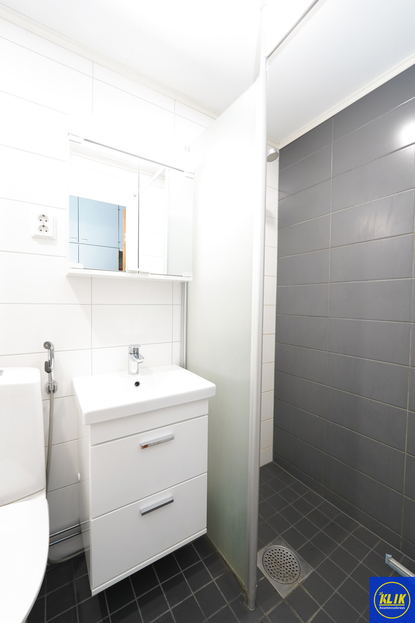 laattalattia; laattaseinä, , allaskaappi; peilikaappi, suihku; suihkuseinä, , pesukonevalmius, kylpyhuoneessa lattialämmitys; taloyhtiössä sauna