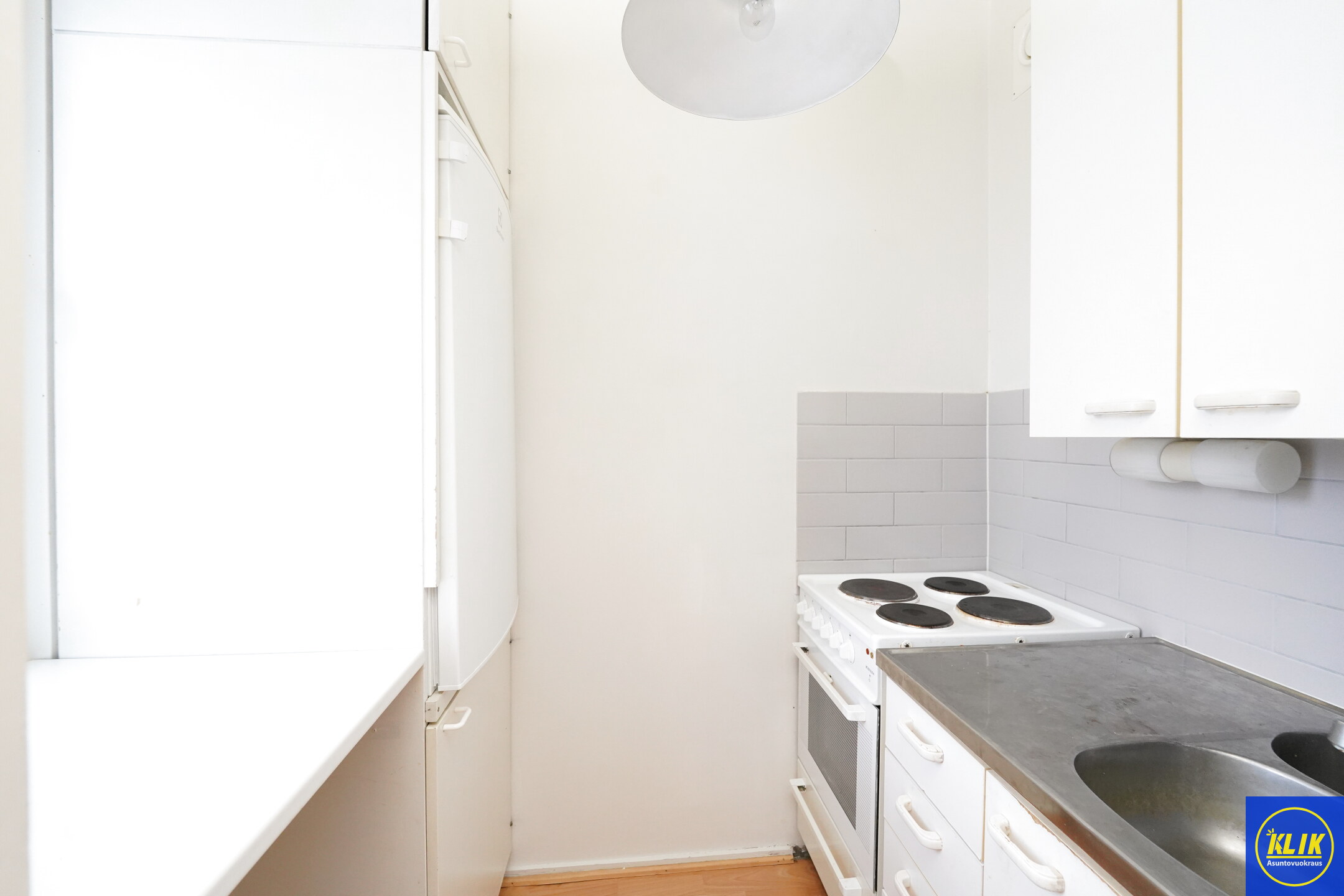 keittokomeroterästasot keittiössä; laminaattitasot keittiössä, sähköliesi, astianpesukone (60cm), jääkaappi, suuri tiskipöytä